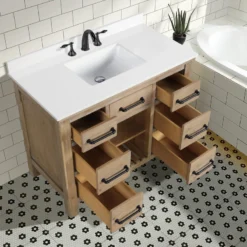 Ari Kitchen & Bath Lauren 42″ Bathroom Vanity, Weathered Fir Finish, White Engineered Stone Counter