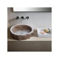 Black Looms Silver Travertine Rustic Stone Vessel Sink Honed Interior Hand Chiseled Exterior