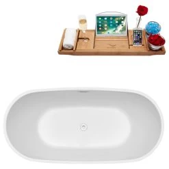Accentuate your bathroom with this Streamline 59″ ellipse shaped bathtub. Its white glossy finish and beveled base will give your bathroom a touch of modern luxury. This tub has an internal drain and can hold up to 61gallons of water. FREE Bamboo Bathtub Caddy Included in Purchase!
