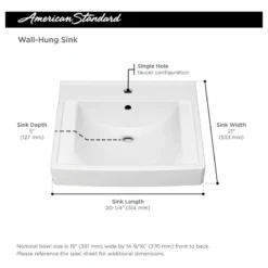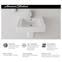 The Decorum Wall-Hung Bathroom Sink from American Standard is a sleek, spacious option for the busiest bathrooms. This contemporary design is made of high-gloss vitreous china featuring EverClean to inhibit the growth of stain and odor-causing bacteria, mold and mildew on the surface. The Decorum Sink from American Standard stands up to the rigors of steady use and high traffic, promising easy-clean convenience, ADA accessibility, and the option to use with or without shroud (sold separately).