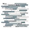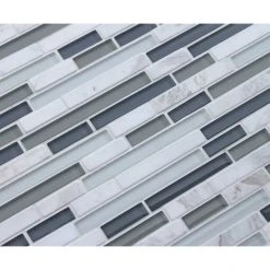 Bliss Iceland random strip glass and marble mosaic tiles. A cool mix of dark blue gray, white, and light gray glass strips combined with a nice bright white marble blend together in this popular random strip mosaic. This is a very popular tile with homeowners for use in a kitchen backsplash or accent strip for your bathroom.