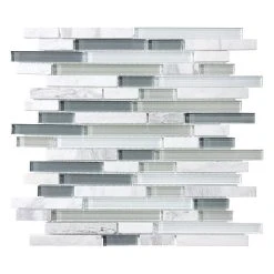Bliss Iceland random strip glass and marble mosaic tiles. A cool mix of dark blue gray, white, and light gray glass strips combined with a nice bright white marble blend together in this popular random strip mosaic. This is a very popular tile with homeowners for use in a kitchen backsplash or accent strip for your bathroom.