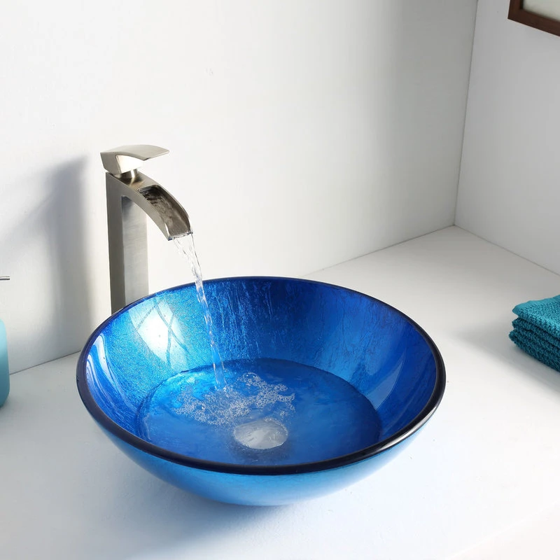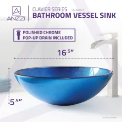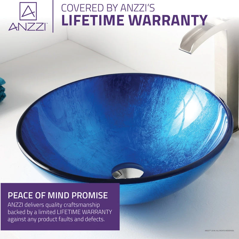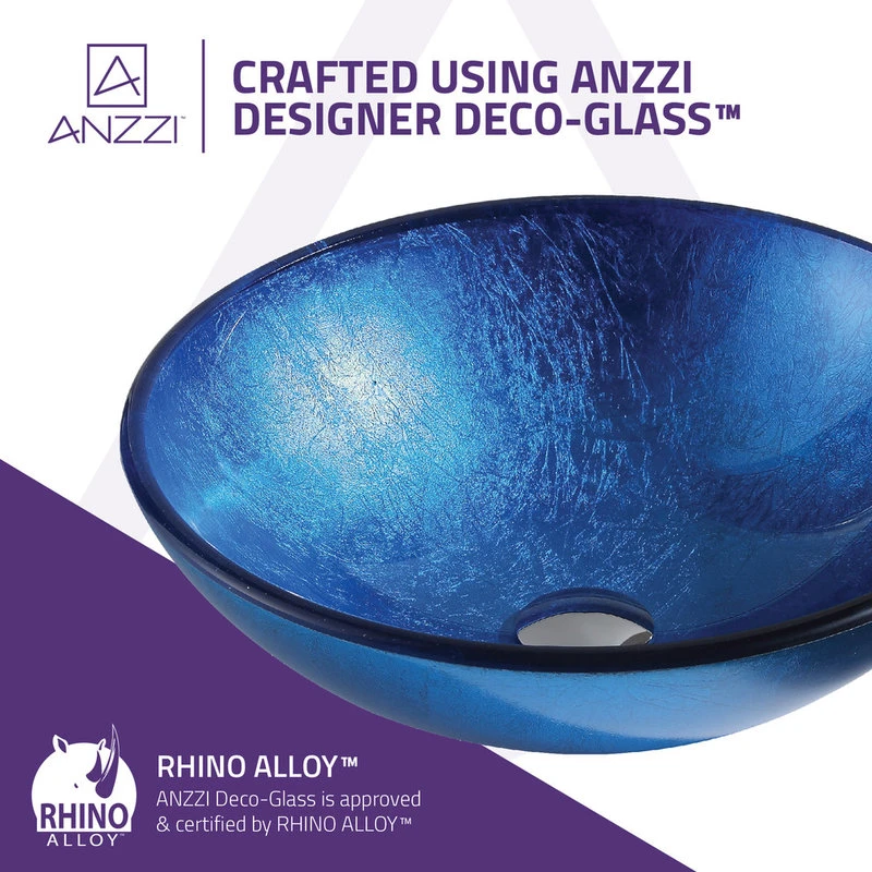 The ANZZI Clavier Series sink is a traditionally crafted round vessel sink adorned in a Lustrous Blue Finish. Each ANZZI vessel sink if formed using RHINO ALLOY certified high tempered Deco-Glass material. The result is a perfectly shaped dynamically captivating vessel centerpiece for any bathroom counter.
