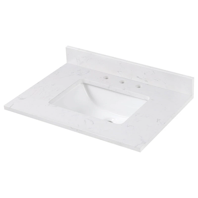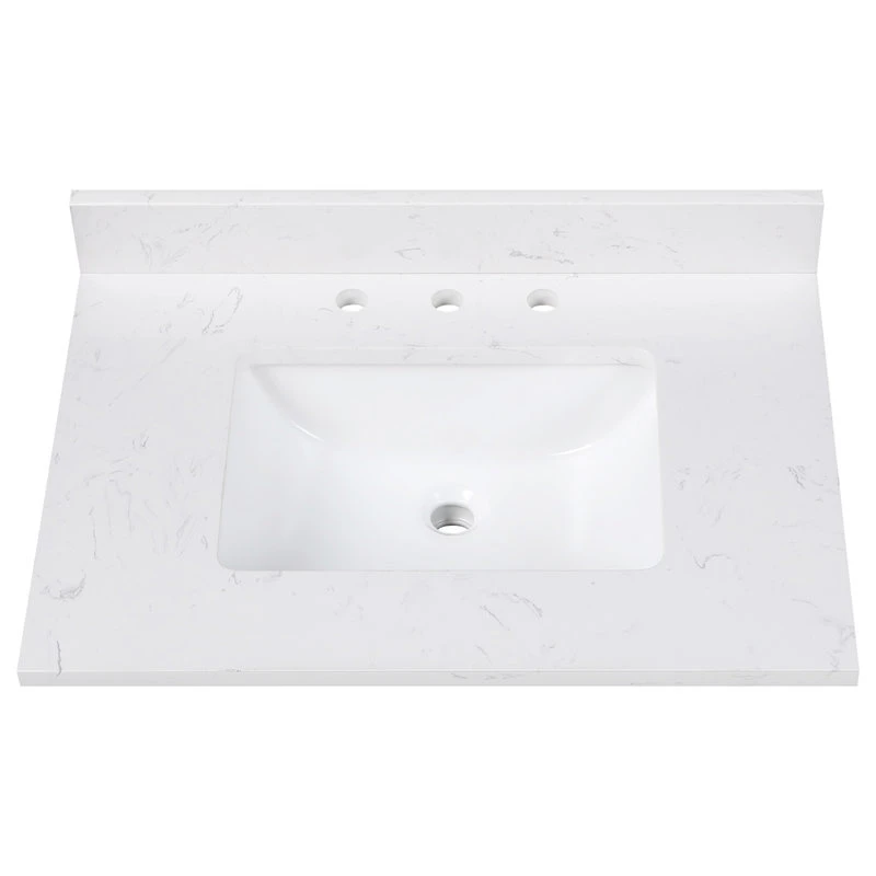 Cala white engineered stone bathroom vanity top will provide you a stunning and clean bathroom with a modern straight edge profile. Easy installation and low maintenance, it also comes with gray veining that mimics Carrara White marble. The vanity top includes a 4″ high back splash and a single rectangular sink. Universal used side splash is sold separately and it can be installed on either left side or right side.