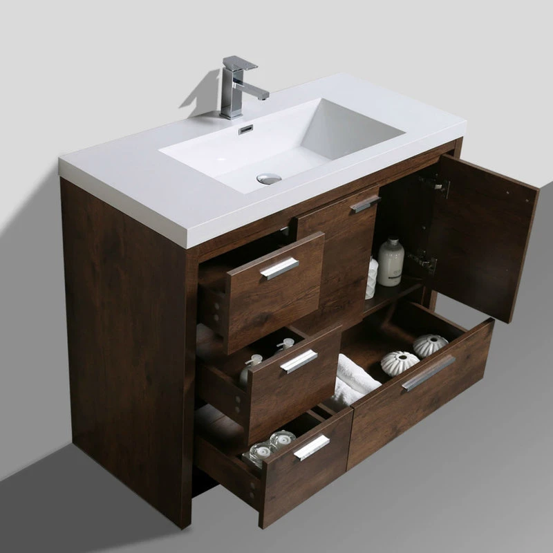 The delightful and charming simple design of the Mod Vanity will blend seamlessly with your bathroom’s modern decor. Free up valuable counter space with the 4 drawers and under-sink shelf. Install this piece in your powder room for an uncomplicated, refined ambience.