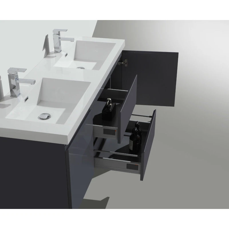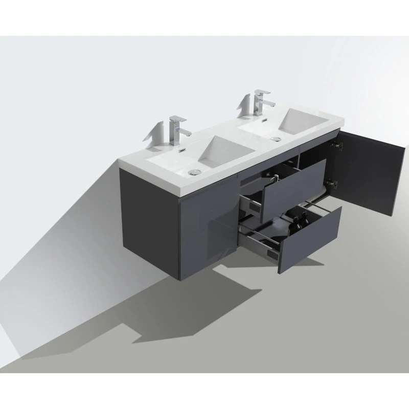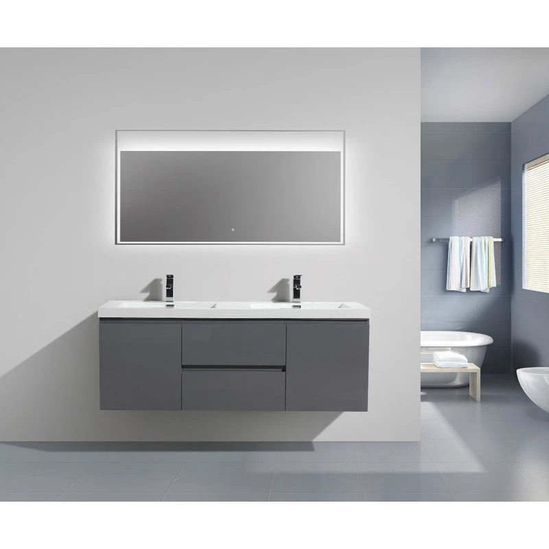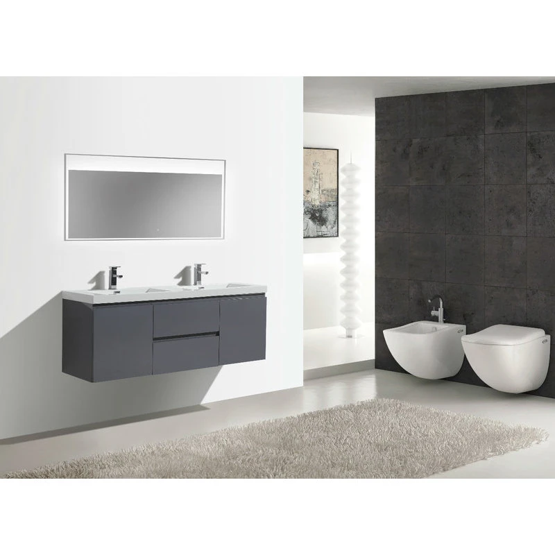 The high gloss gray MOB Wall-Mounted Vanity With Reinforced Acrylic Sink measures 60 inches in width and offers plenty of space and storage. This piece features soft-close, handleless doors and drawers for a sleek, sophisticated look. Its waterproof body is topped a reinforced acrylic countertop and a sink with a rectangular, chrome overflow. This piece is a bold, contemporary statement for your bathroom.