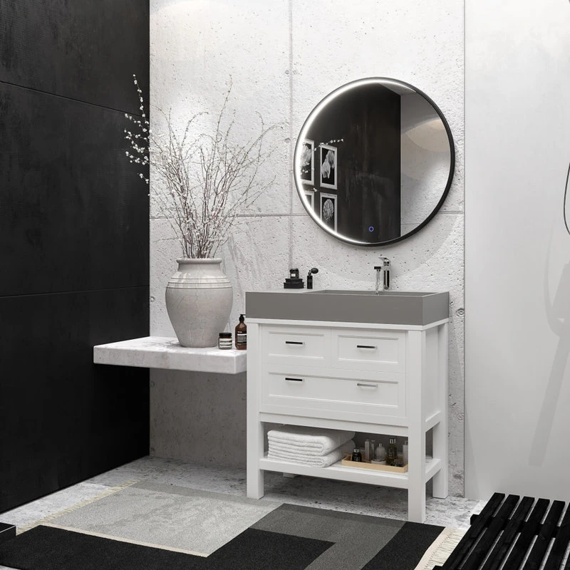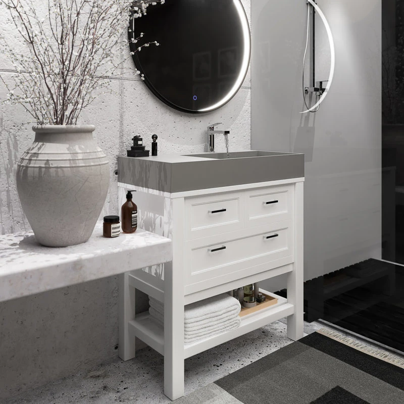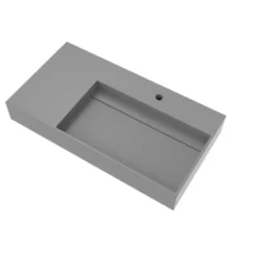 Embrace modern design and feel with this minimalist vanity top. Simple yet sophisticated, this modern countertop’s rectangular design with clean lines works well in many bathroom décor configurations and setups. Made with high-quality and durable solid surface material, this vanity top features a clean and consistent color throughout as well as durable construction to ensure lasting quality and appearance. The surface can be easily cleaned with most non-abrasive cleaning agents. A great accent for any washroom, bathroom, or power room.