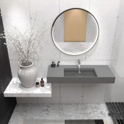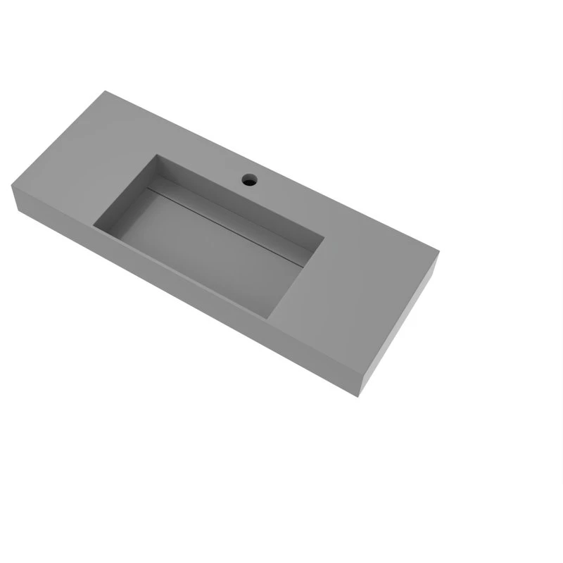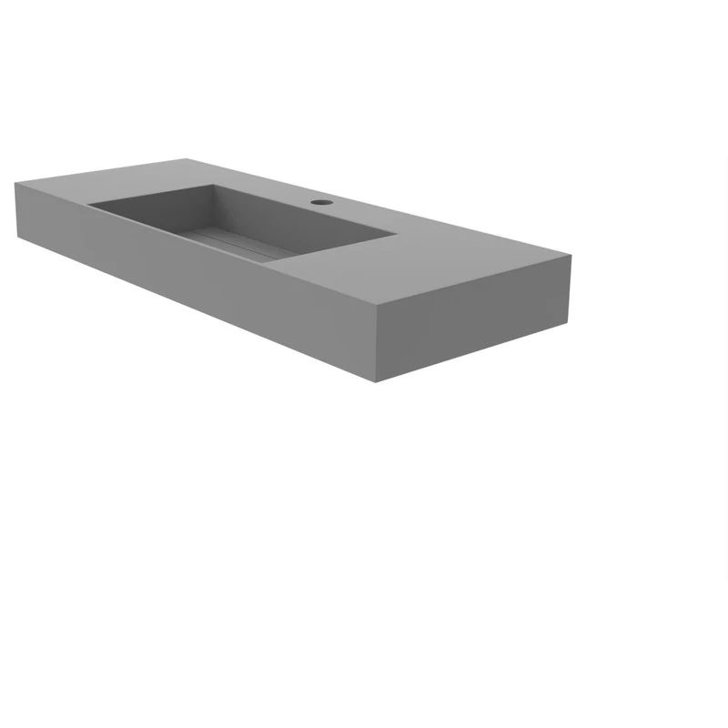 Embrace modern design and feel with this minimalist vanity top. Simple yet sophisticated, this modern countertop’s rectangular design with clean lines works well in many bathroom décor configurations and setups. Made with high-quality and durable solid surface material, this vanity top features a clean and consistent color throughout as well as durable construction to ensure lasting quality and appearance. The surface can be easily cleaned with most non-abrasive cleaning agents. A great accent for any washroom, bathroom, or power room.