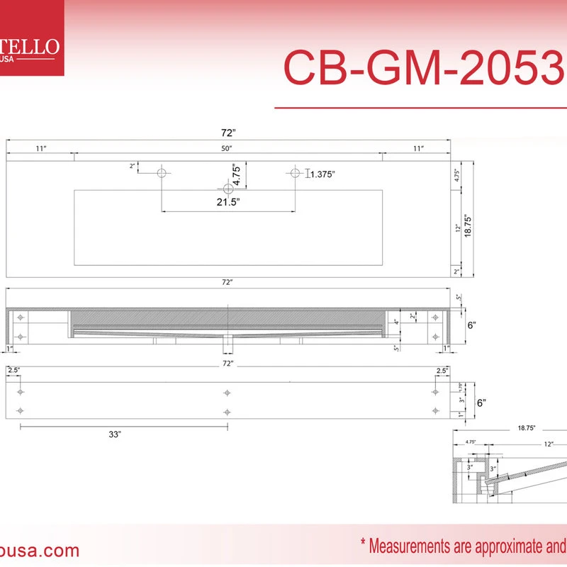 Castello USA Pyramid Solid Surface Bathroom Vanity Top, Gray, 72″, Standard