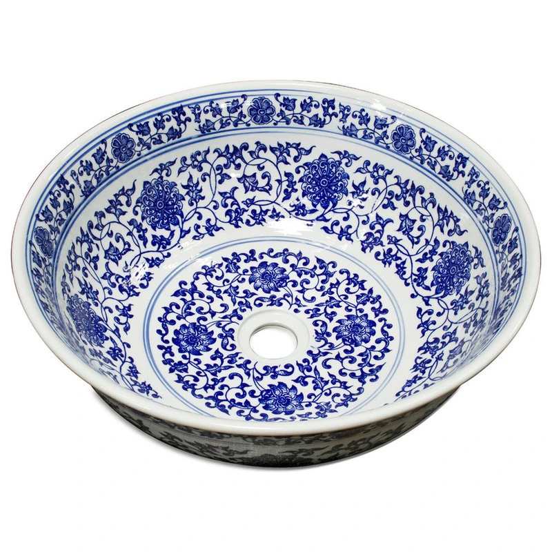 Known for its tranquil beauty, blue-and-white porcelain has long been a favorite for the British import from China since the 18th century. This porcelain basin is completely hand made of fine porcelain and decorated with floral motif. It is an eye catching piece when used as a center piece. Also can be used as a vessel sink bowl. Imported from China.