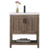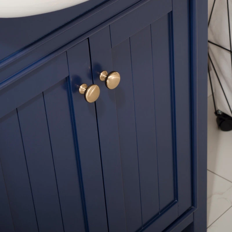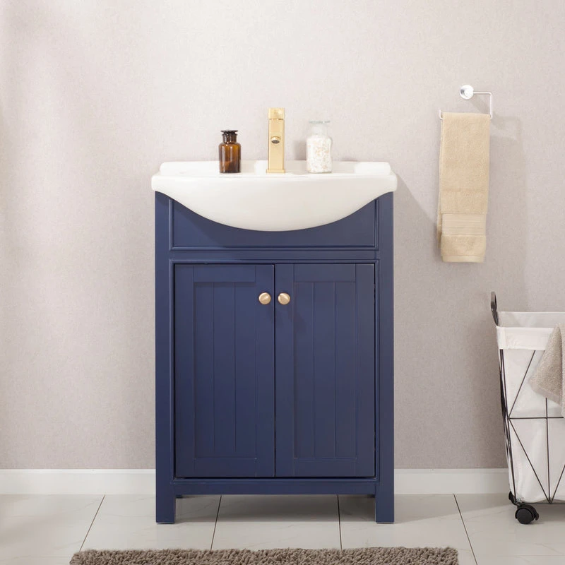 The Marian 24″ Single Sink Vanity by Design Element provides the perfect finishing touch to your bathroom remodel project. Constructed of solid hardwood, this vanity will maintain its beauty and functionality year after year. The porcelain countertop and integrated sink with overflow perfectly matches the styling of the cabinet, and is extremely simple to maintain. Opening the 2 soft closed doors reveals an ample storage space. The included satin gold hardware provides the perfect finishing touch to the blue cabinet. Faucet and drain are not included.