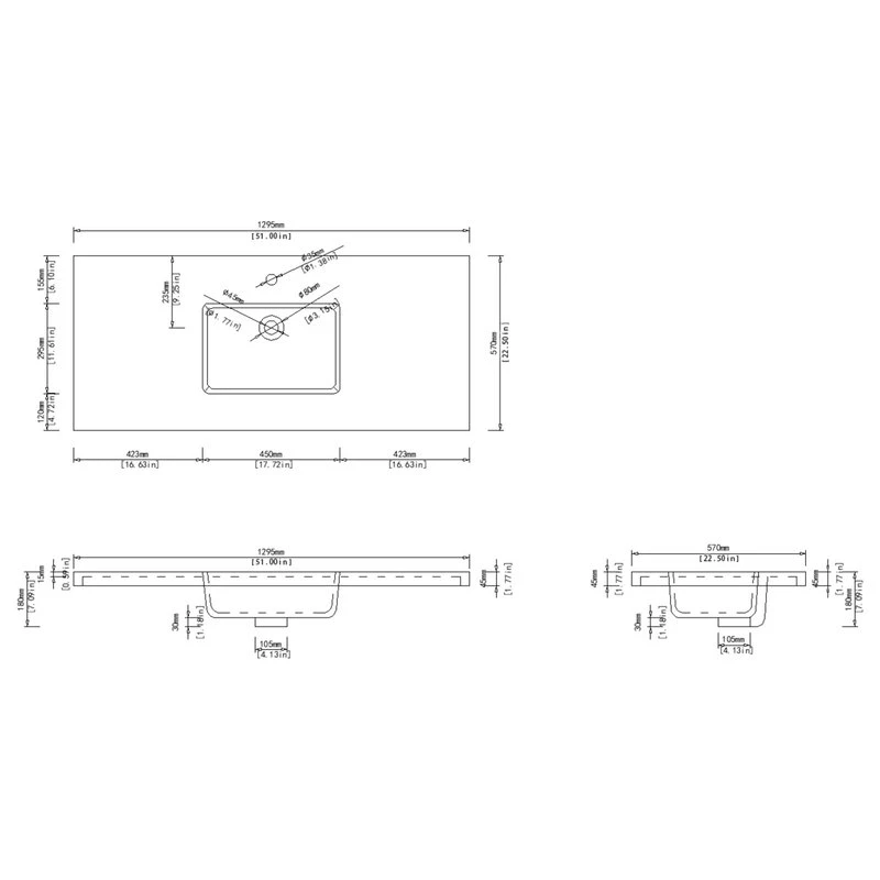 Dyconn Faucet Carrara series solid surface countertop is cast out of a mixture of stone, aluminum and acrylic resin. The stain-resistant material is easy to clean and maintain. Due to its special mixtures, the material can be sanded down for removing scratches and restored to its original matte finish within a matter of seconds. The Carrara vanity top is integrated with a contemporary deep rectangular basin bowl to minimize water splash. Carrara Series comes in 25″, 37″, 51″, 63″ and 74″, and the single basin design maximizes the countertop space (except 74″). NOTE: The Carrara vanity top is designed with a hangover edge around the standard vanity cabinet. Compatible with vanity size 24″, 36″, 48″, 60″ and 72″.