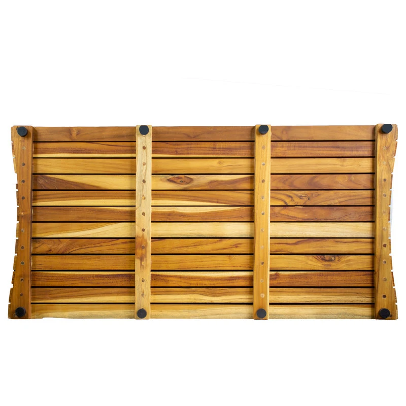 EcoDecors non slip 40″ x 20″ solid teak floor and shower mat provides elegant functionality in our out of the shower. The non-slip feature is another 1st of its kind innovation from DecoTeak. The cut lattice pattern not only provides a beautiful decor accent but also provides a functional nonslip surface. Slipping and falling is the number one cause of injuries among older adults, and the bathroom is the number one place this occurs. In a constant effort to fuse beauty with functional safety features, DecoTeak continues to innovate in its line of teak bathroom furniture. The teak shower mat has a nonslip rubber track on the back to prevent the mat from shifting on the shower floor. Slats provide space for ease of water drainage through the floor. Teak is naturally water, mold, and mildew resistant due to its natural density and high oil content. It has been the wood of choice for hundreds of years of luxury boat builders. This teak mat to be used outdoors as well as indoors