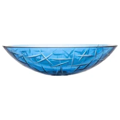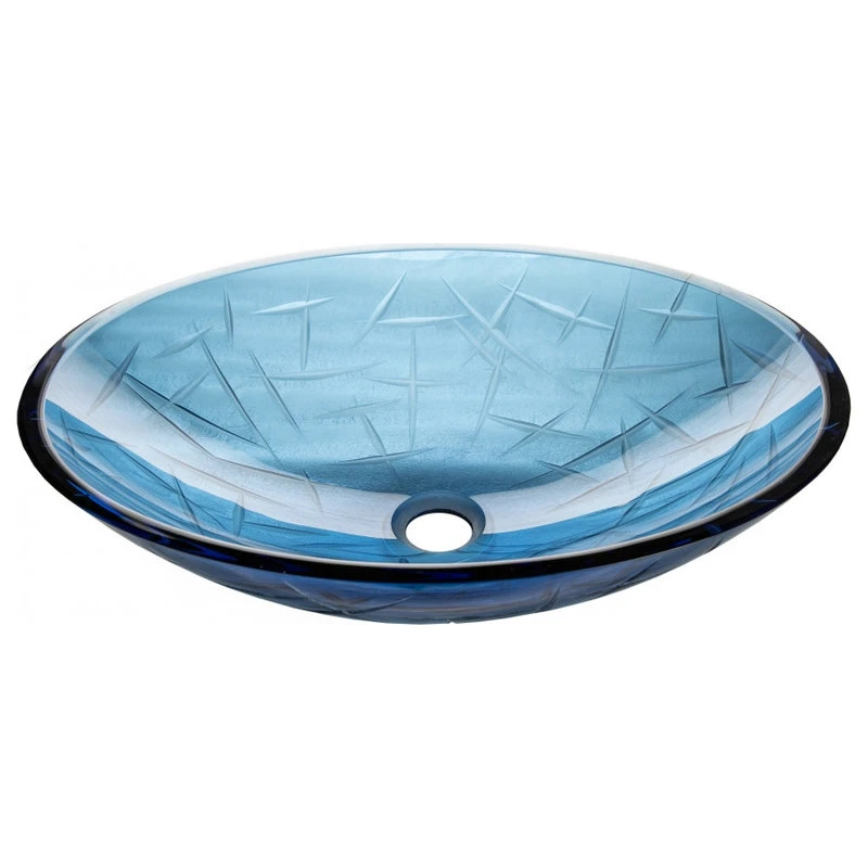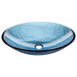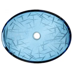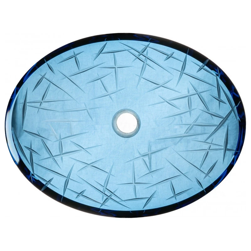 The Eden Bath Blue Crystal Oval Glass Vessel Sink features a beautiful transparent, royal blue coloration with crystal style cut patterns in it. The oval, tempered glass sink has a smooth, polished interior and polished exterior with cuts in it. The crossing lines and blue coloration make a striking appearance for your bathroom. We recommend that you also purchase a drain and mounting ring with your glass bathroom sink bowl in the same finish of your faucet.
