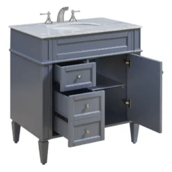 This classic hand painted marble-topped vanity console from our “Park Avenue” collection is roomy enough to keep all your bath essentials close at hand. Fitted with a spacious Italian Carrara white marble counter top and an oval porcelain undermount sink, you’ll naturally enhance your home or office bathroom with both its beauty and practicality. In the hand painted gray cabinet are 2 full-extension drawers and a 1-door cabinet space, each of which are accented with brushed steel knobs. This contemporary vanity console’s simple, straight-line designed cabinet sits atop four graceful tapering legs, Please note that due to the natural characteristics of the stone, the color and/or pattern of each countertop may vary from the pictures. No two slabs of marble are the same!- Measurements: W32″ x D21-1/2″ x H35″ – Authentic Carrara white marble counter top imported from Italy – Pre-drilled faucet holes, 8″ spread – Under mount porcelain sink – Constructed of kiln dried solid wood and MDF – 1 soft-closing door with 1 shelf inside – 2 full extension drawers — the lower drawer is deeper for easy-access, extra storage – Faucets shown are not included. Minor assembly of legs required.