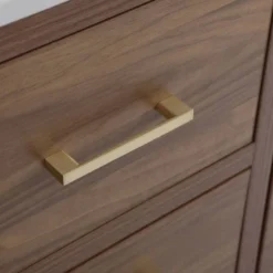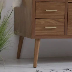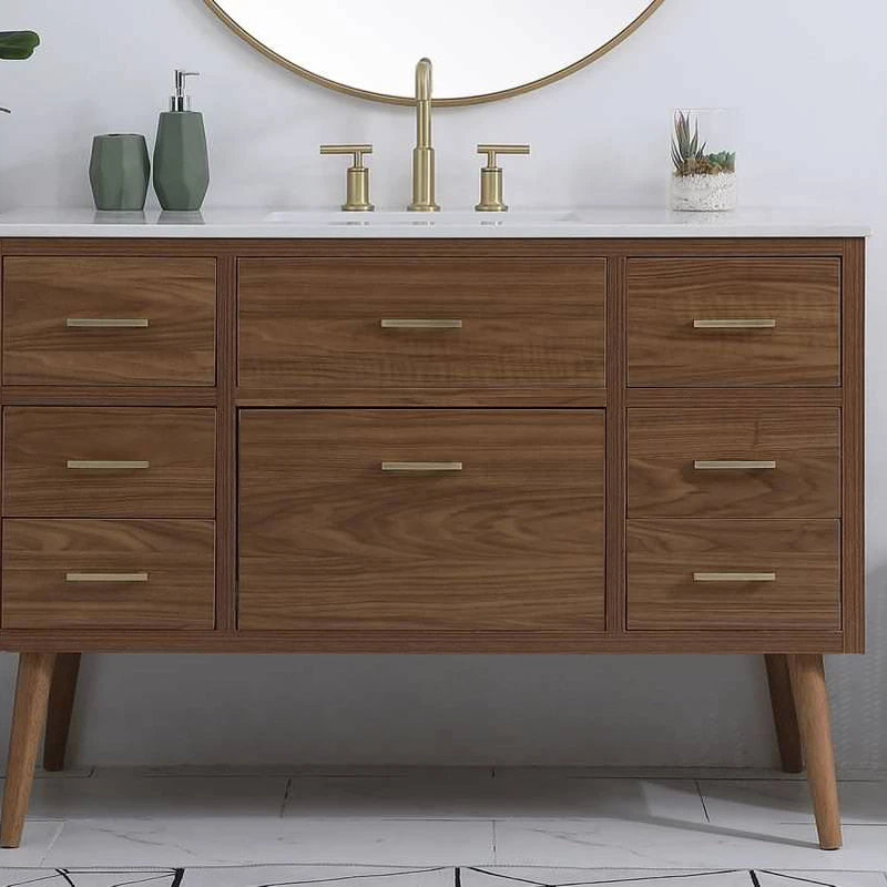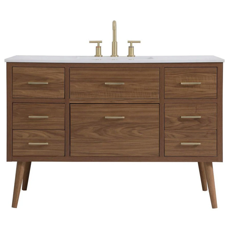 Delve into a world of minimalistic fashion and contemporary styling with this midcentury modern 48″ vanity. The clean lines anchors the design, while the oblique tapered cylinder legs add subtle interest. However, the artful juxtaposition between the walnut brown and matte white creates a blend of bright modernity and classical traditions. A gold handle adorns the top fake drawer hiding the base of the integrated porcelain sink while another one allows you to pull the bottom drawer out, letting you store your bathroom necessities and toiletries. The compact size makes it the perfect vanity for any bathroom or powder room, regardless of size.