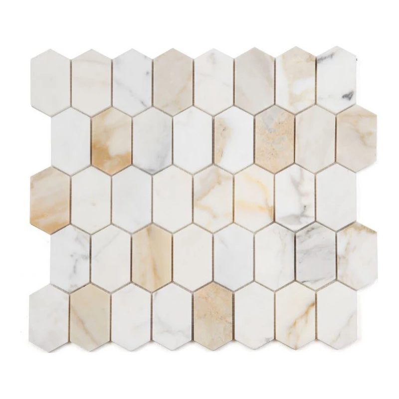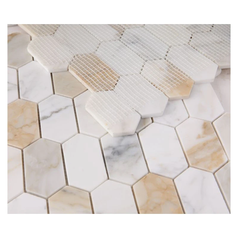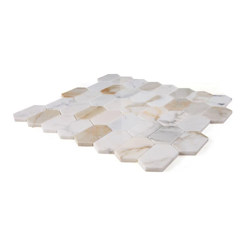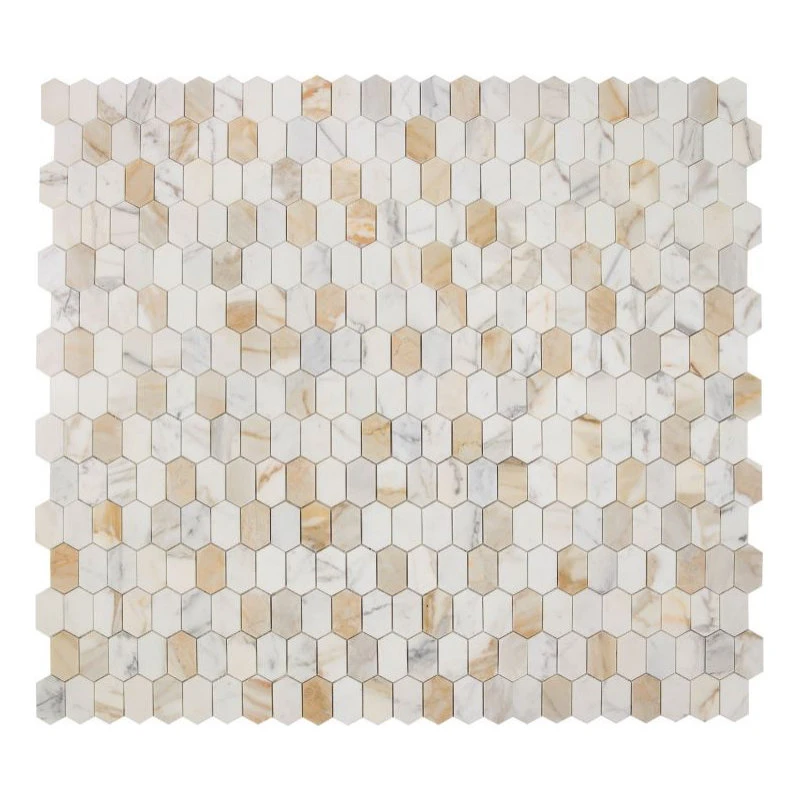 - Montage Calacatta Gold Polished 12.5×13.25 – Calacatta Gold marble in an elongated hexagon shape. Previously named “Montage Calacatta Gold”