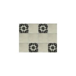 This Talavera ceramic tile has an black 8-petal flower in the center along other decorations mostly in a Mexican white background. The pictures show the patterns when four or more are put together and when a single tile line is assembled together.This talavera ceramic tile is just an example of the exquisite beauty the Mexican craftsmen put on each item they create. It is hand-painted, this means that no two tiles are exactly alike! There might be small differences in size, weight and even the paintings. Because it is handmade, it is not perfectly flat as are machine-made ones, it might even be bent, which will result in not totally flat walls. This tile is special for small patches or entire wall decoration, however, Talavera tile is primarily intended for accents.