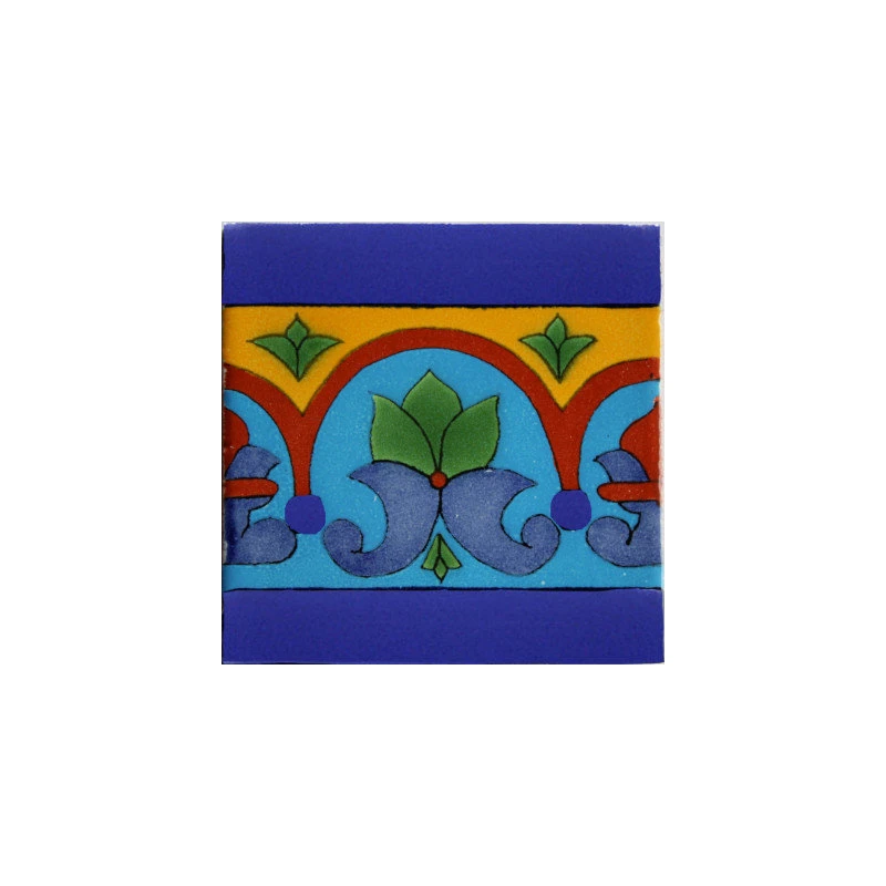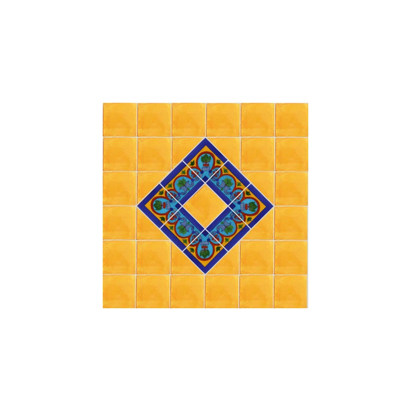 This Talavera tile is hand-painted using cobalt blue, gold yellow and aqua background. It has very vivid colors, with flowers in the center. A picture is worth thousand words, just check it out! This tile can be used as a liner tile in any wall or horizontal surface, as shown in one of the pictures. The tile is handpainted, this means that no two tiles are exactly alike! There might be small differences in size, weight and even the painting. If you want to enhance that little spot in your wall, pool or any indoors/outdoors space, this is what you are looking for! In the additional pictures this tile is shown as an accent diamond inside the gold yellow clay tile.