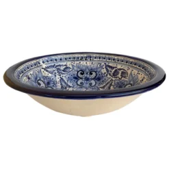 Fine Crafts Imports TalaMex Cholula Oval Multicolor Talavera Ceramic Bathroom Sink. Total depth is 6.5″, but inside depth is 5″. The drain is standard 1.5″ diameter. It is a beautifully decorated sink made in the traditional way. Highly skilled artisans have been making this type of Ceramic in the city of Puebla for hundreds of years and this particular style is among Mexico’s finest and most intricate work.