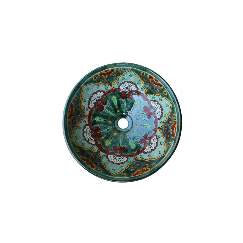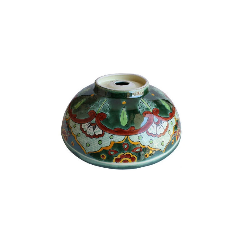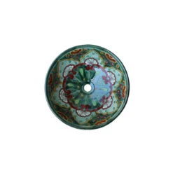 This bathroom vessel sink has a dark green border and is accented with some terracotta motifs. It is intended to be over-mounted. Its exterior surface is painted as well as the interior one. It has a round base (where it sits) about 6 in diameter and 1″ tall. The inside dimensions are about 14″ by 4 1/2″ deep. It doesn’t have an overflow system and a standard 1.5″ drain opening.”