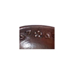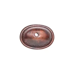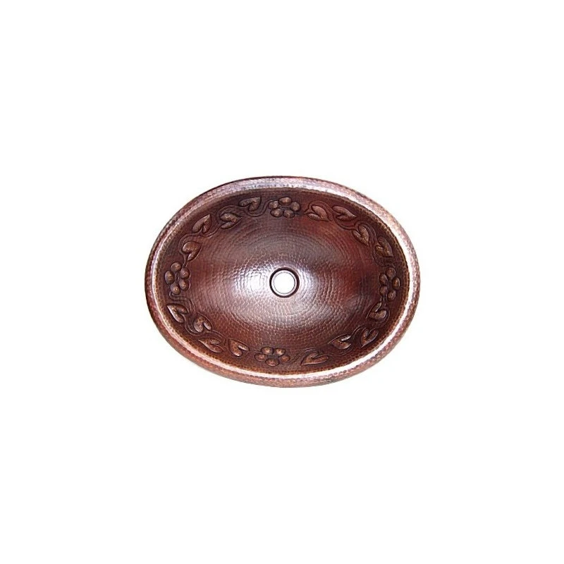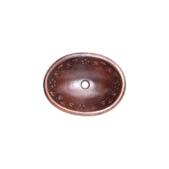 This bathroom copper sink has a standard 1.5 diameter hole at the bottom center and it does not have an overflow system. It is designed for over-the-counter mounting because its rim is rounded. This hammered bathroom copper sink is a beautiful piece of art.It has embossed flowers and leaves connected together all the way around it, details can be observed in the pictures. From a copper sheet the wise artisan hands transform it into this unique piece. The hammer footprint is very visible. The reddish/oxidized texture is characteristic of natural copper when it is cooled down from red-hot temperature using cold water, technique in use by the copper-smiths. The border is rounded, this allows to sit on your counter top.This copper sink was made from one sheet of copper, raised with the artist hammer, there are no welded joints, as a matter of fact, the flowers and leaves were pulled out of the copper sheet itself.Hammering the red-hot copper is an ancient technique the copper-smiths still use, where no power tools are used, just the furnace to heat the copper and a hammer to give it the shape. We got this bathroom copper sink from the skilled copper-smiths from Santa Clara del Cobre, Mexico. The finish is in a dark brownish color. Suitable for your bathroom, it will add a unique home accent making it a very special point of attraction in your bathroom. The copper sheet is 16 gauge (0.05″ thickness).IMPORTANT NOTE: The patina can be damaged faster if toothpaste stays for long periods of time on the sink surface, because of this, washing it after brushing teeth is recommended.”