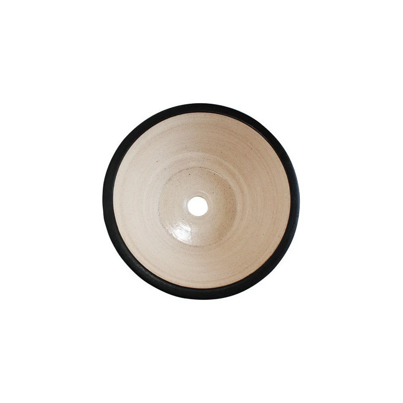 This vessel sits on top of your vanity. The drain hole is a standard 1.5″ diameter, sitting at the bottom center of the vessel. Body shape is conic. Color is black outside and ivory inside, with a rustic looking. Fango vessel sinks are created by a combination of craftsmanship and automation. The core is handmade by a professional craftsman using mostly silica. The surface is hand-painted using natural earthy colors. The firing process is carried in an electrical kiln at over 1000 degrees, insuring a long-lasting ceramic product that you will enjoy for years to come.