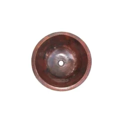 This round bathroom copper sink has a standard 1.5 diameter hole at the bottom center and it does not have an overflow system. The copper sheet is 16 gauge (0.05″ thickness). This hammered bathroom copper sink is a beautiful piece of art. From a copper sheet the wise artisan hands transform it into this unique piece. The hammer footprint is very visible. The reddish/oxidized texture is characteristic of natural copper when it is cooled down from red-hot temperature using cold water, technique in use by the copper-smiths. The rim is flat, allowing it to be under mounted.This copper sink was made from one sheet of copper, raised with the artist hammer, there are no welded joints.Hammering the red-hot copper is an ancient technique the copper-smiths still use, where no power toos are used, just the furnace to heat the copper and a hammer to give it the shape. We got this bathroom copper sink from the skilled copper-smiths from Santa Clara del Cobre, Mexico. The finish is in a dark brownish color, which hides partially the natural copper-looking, but it gives it an antique look. Suitable for your bathroom, it will add a unique home accent making it a very special point of attraction in your bathroom.IMPORTANT NOTE: The resin layer can be damaged faster if toothpaste stays for long periods of time on the sink surface, because of this, washing it after brushing teeth is recommended.”