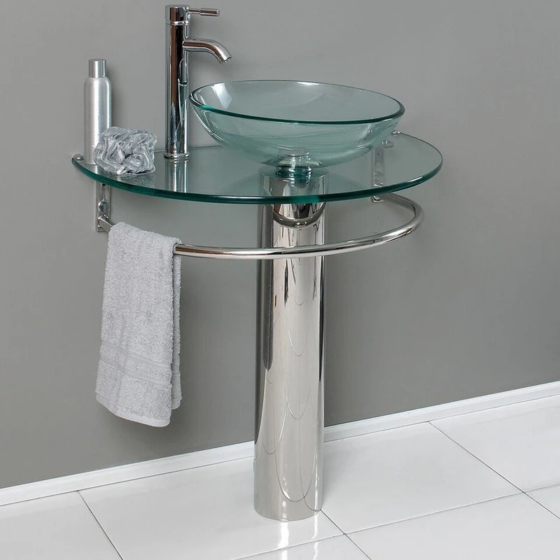 This modern glass pedestal sink is simple yet stunning. It features a gently sloped, glass vessel basin and a lovely tempered glass demi circle counter top with a single hole faucet mount. The sleek chrome stand is designed to be as practical as it is stylish _ __it offers the perfect spot for a hand towel. This elegant pedestal vanity measures 29 _ __ in width and would blend beautifully into any bathroom. Overflow-No,Sink Color-Clear,Sink Dimensions-16.5″x16.5″x5.5″