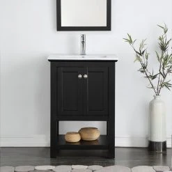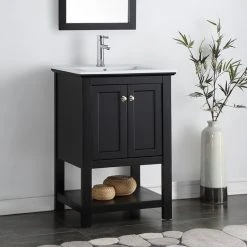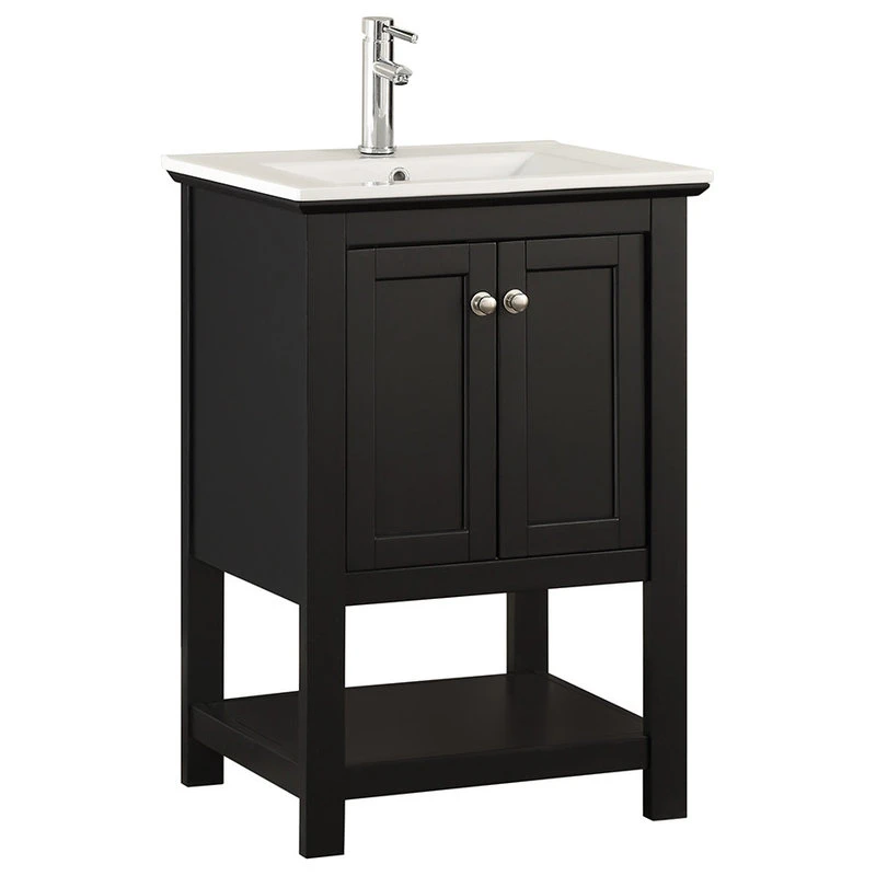 Brighten your bathroom or powder room with the clean, timeless design of our Fresca Manchester 24″ Traditional Bathroom Vanity. This beautifully constructed vanity features panelled solid wood doors with innovative soft close hinges to ensure they close silently and effortlessly every time. Designed to complement any decor scheme, this traditional vanity features a chic, painted Black finish and brushed nickel handles. An open bottom shelf is ideal for storing towels and additional bath supplies. A lovely white ceramic sink with rounded basin adds to the vanity’s clean aesthetic. It is equipped with an integrated overflow and single hole faucet mount. This stylish vanity is offered in a choice of several finishes. It includes installation hardware and is also available in a 30″ size. The matching Fresca Manchester Black Traditional Bathroom Mirror (sold separately) completes the look.