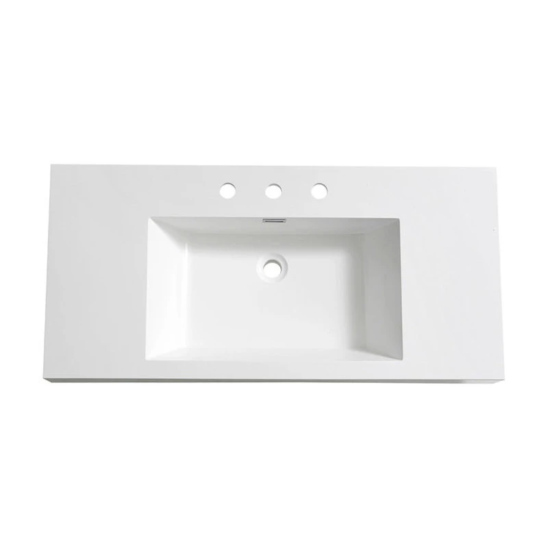 The contemporary Fresca Mezzo integrated sink and countertop makes a lovely addition to any bathroom decor. The contemporary linear design of this handsome white rectangular basin features sharp, clean lines and a thick, smooth profile. Designed for busy mornings, the sink is spacious and the countertop is ideal for holding the basics. Other features of this chic sink include an overflow and a widespread 8″ faucet mount, allowing for plenty of faucet options.