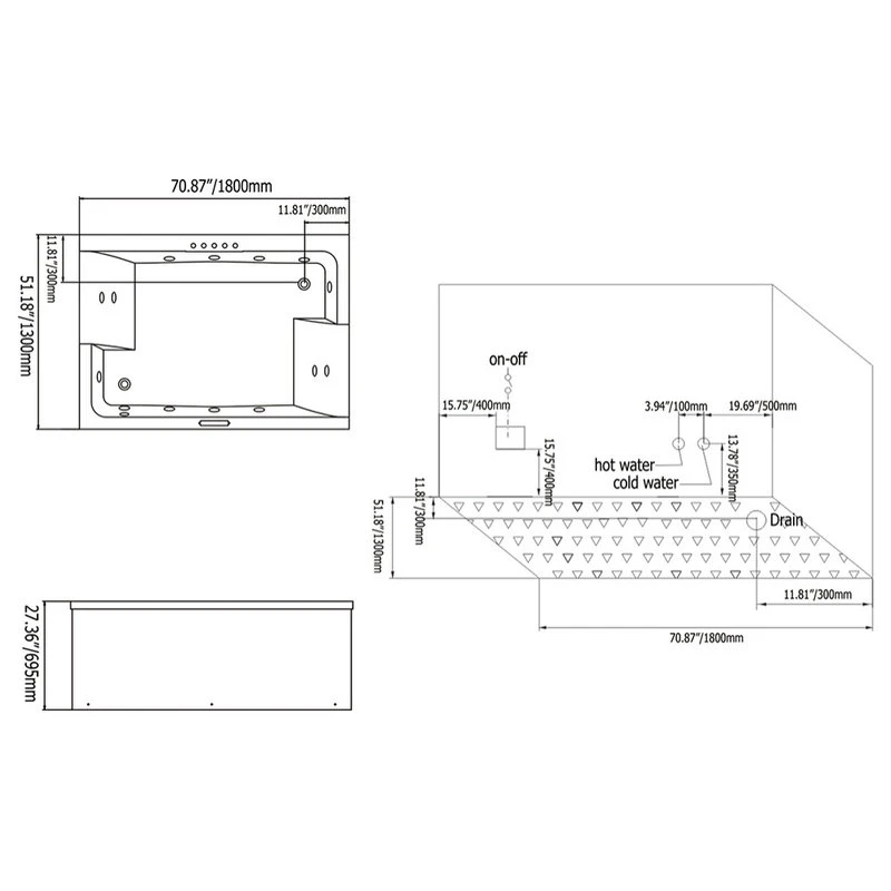 - Exterior Dimensions: 70.87″L x 51.18″W x 27.36″H (1800mmL x 1300mmW x 695mmH)