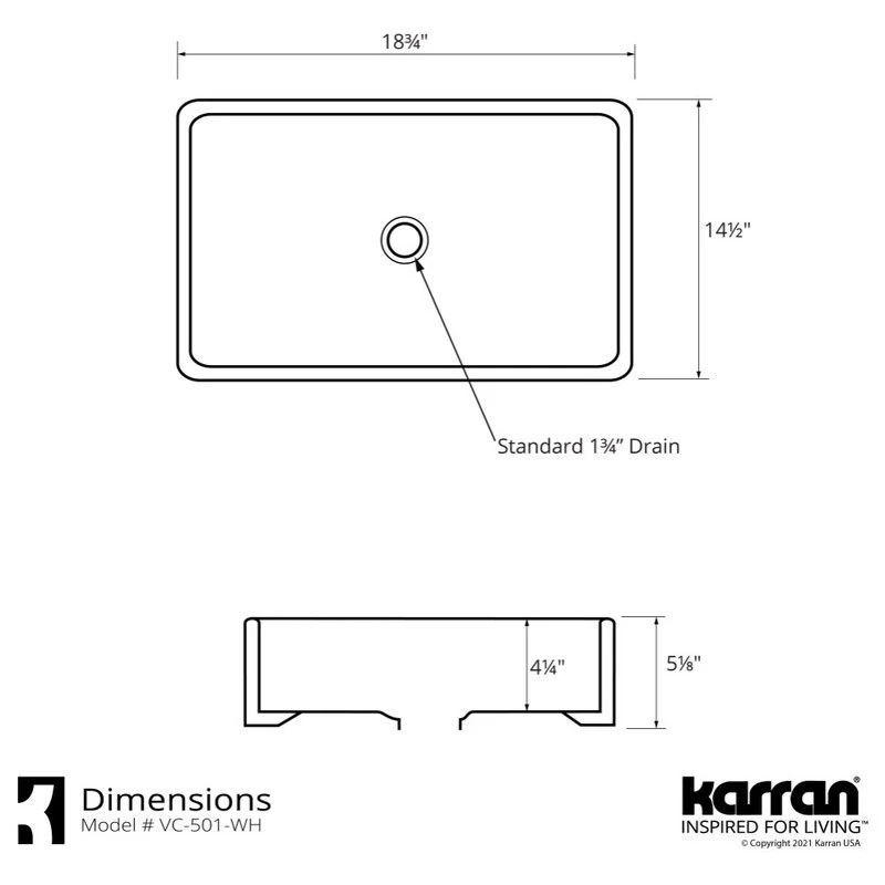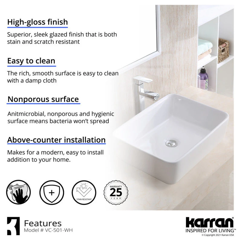 This spacious, rectangular vanity bowl, designed for above-counter installation, is the epitome of style. Its durable, high-gloss finish offers visual appeal and the double-glazed finish provides a durable, resilient surface that is easy to clean and care for.
