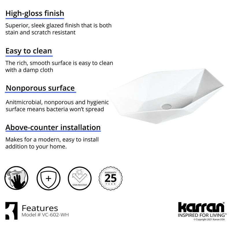 Make a statement in your bathroom with this above-counter vessel sink. Its geometric design and extra-large bowl will be the focal point in your new bathroom. Featuring a high-gloss, double-glazed finish that provides a durable, resilient and easy to care for surface.