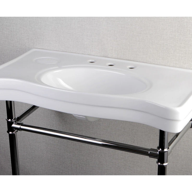 Fauceture console sink combines style and function with its stainless steel console stand and vitreous china countertop. Brass console stand available in different finishes.