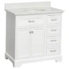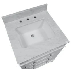 This bathroom vanity set by Kitchen Bath Collection includes a fully painted cabinet with soft close drawers, Italian Carrara marble countertop, and single undermound ceramic sink. Order now and we will include a matching backsplash as a free gift! All vanities come fully assembled by the manufacturer, with countertop and sink pre-installed.