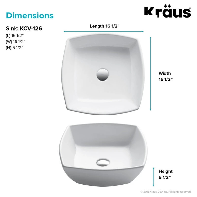 - Sink Dimensions: 16 1/2″ L x 16 1/2″ W x 5 1/2″ H