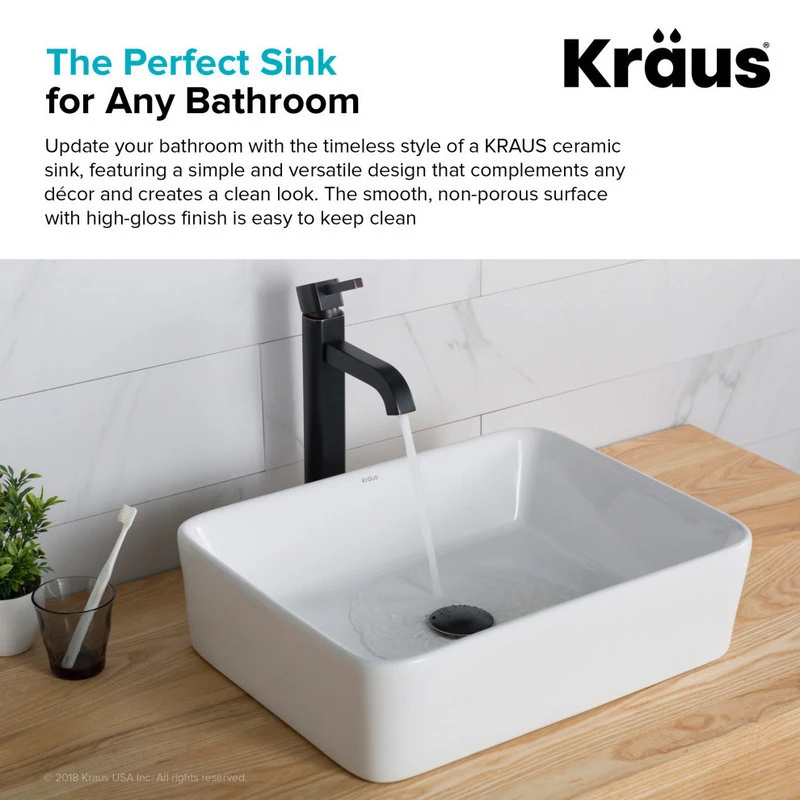 Update your bathroom with the clean look of a KRAUS ceramic sink. The versatile design features a premium baked-on glaze for a high-gloss finish that’s easy to clean, and complements any decor from classic to contemporary.