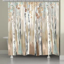 “Ivory, teal, and brown combine into a seamless portrayal of a grove of beech trees. “Woods at Dusk” is an abstract wood art shower curtain, transporting you into a stylized forest the moment it catches your eye. Silver greens and browns create a soft background for the highly textured beech trees that make up the foreground. This design is perfect for cabins or any bathroom with a neutral color palette.