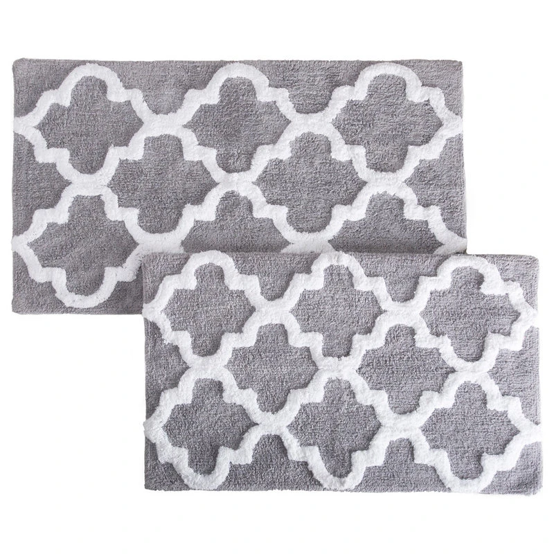 Bring life to your bathroom with the premium 100% Cotton 2 Piece Trellis Bathroom Mat Set. The Trellis pattern brings a European regal look right to your bathroom. A transparent anti-skid spray latex backing is added for keeping rugs safely in place. These super absorbent 100% cotton rugs are machine washable. Extremely plush with cut loop velour finish, this bath mat set feels as luxurious as it looks.