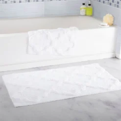 Bring life to your bathroom with the premium 100% Cotton 2 Piece Trellis Bathroom Mat Set. The Trellis pattern brings a European regal look right to your bathroom. A transparent anti-skid spray latex backing is added for keeping rugs safely in place. These super absorbent 100% cotton rugs are machine washable. Extremely plush with cut loop velour finish, this bath mat set feels as luxurious as it looks.