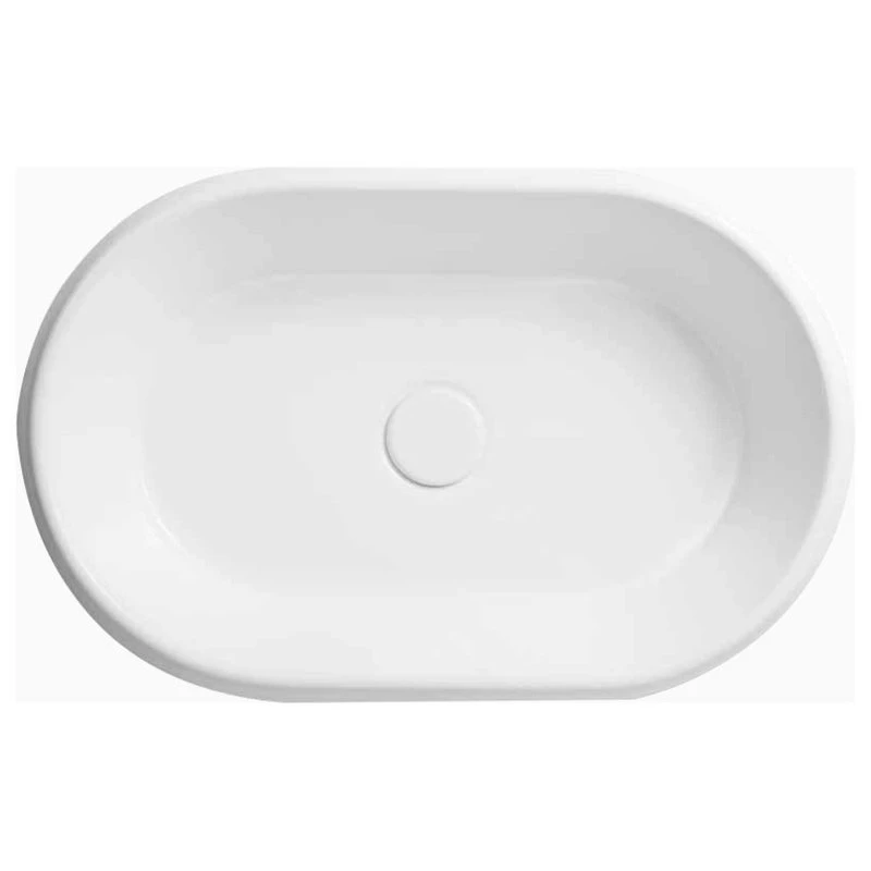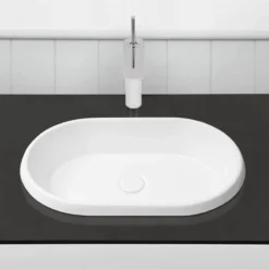 A fusion of classic and modern design, the Ovi vessel sink sits above counter in unquestioningly contemporary style. An oval body and level floor with a covered drain are complemented by sloped walls and a subtle plinth for a unique look.
