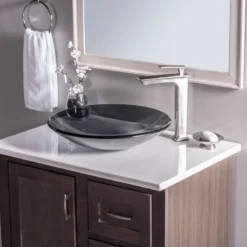- Clear black low profile glass vessel sink provides the perfect balance of functionality and aesthetic appeal