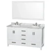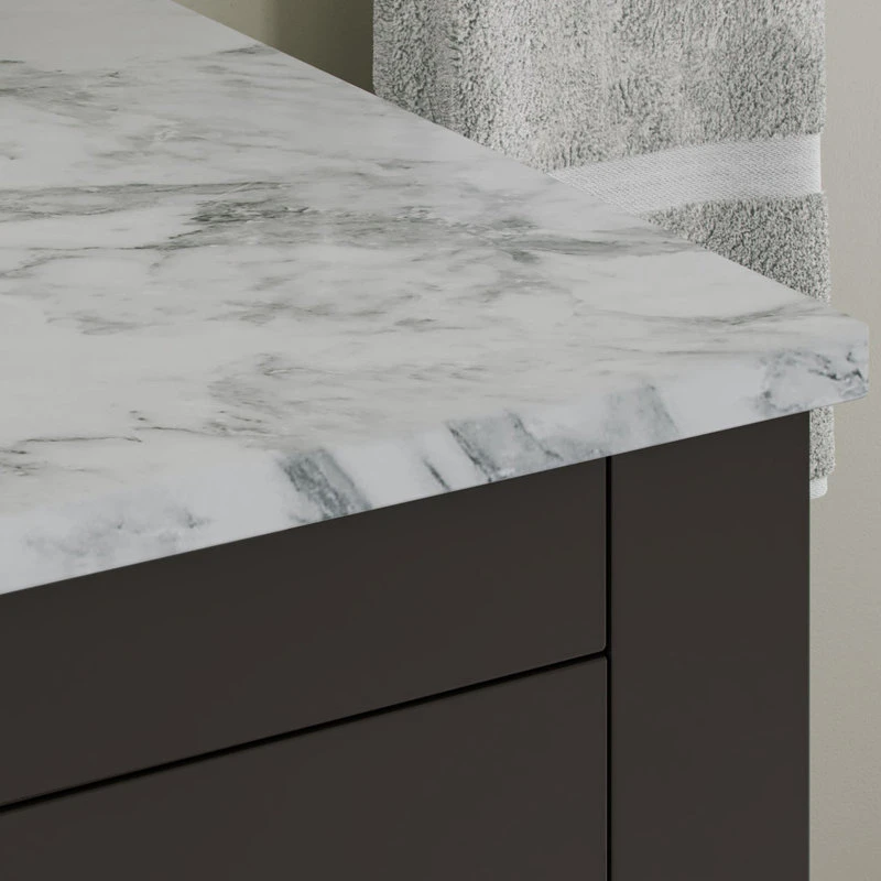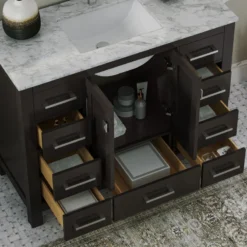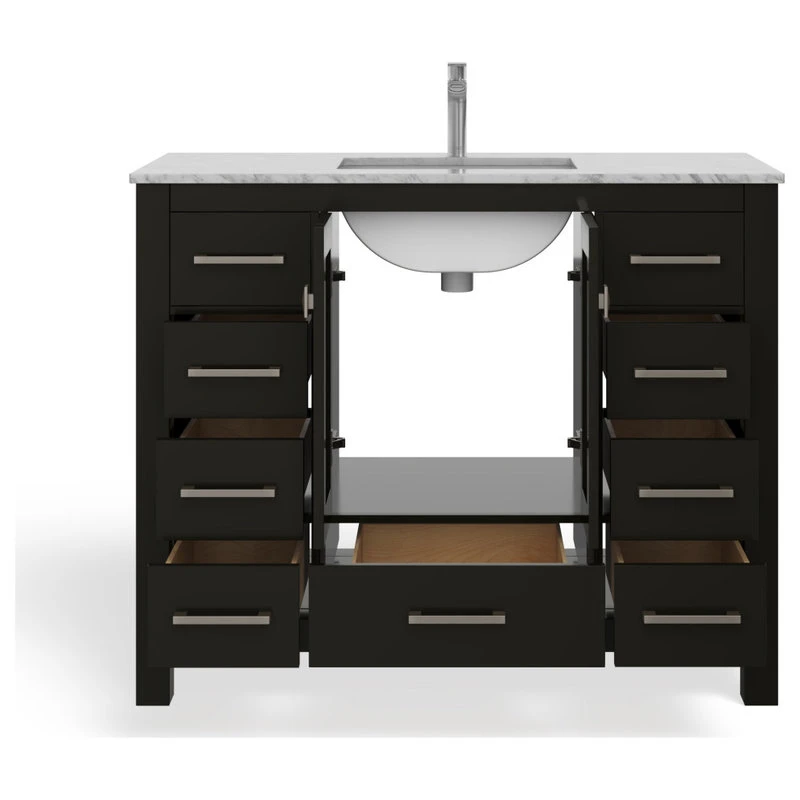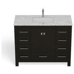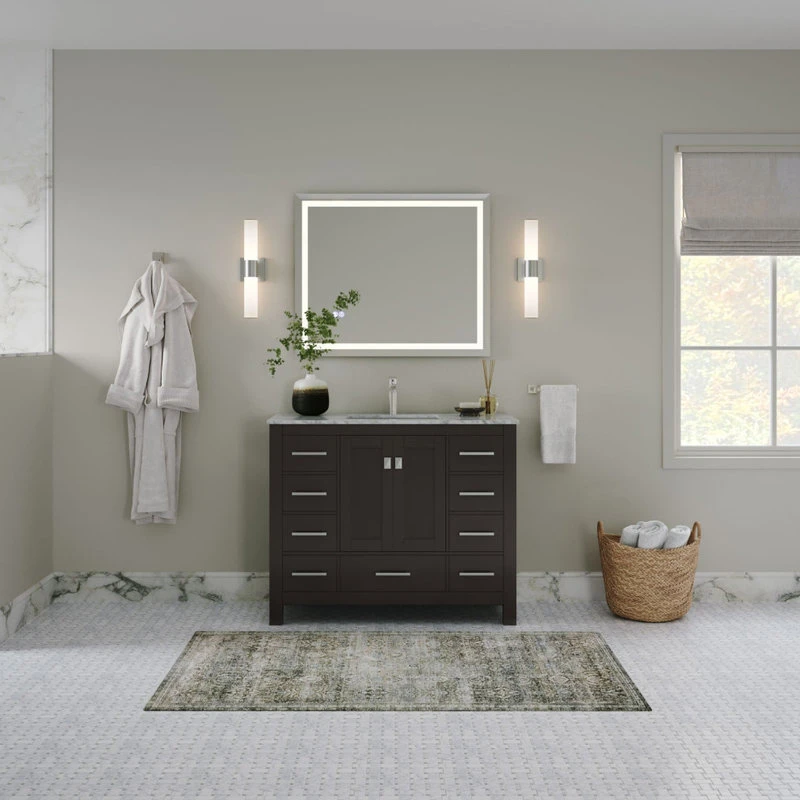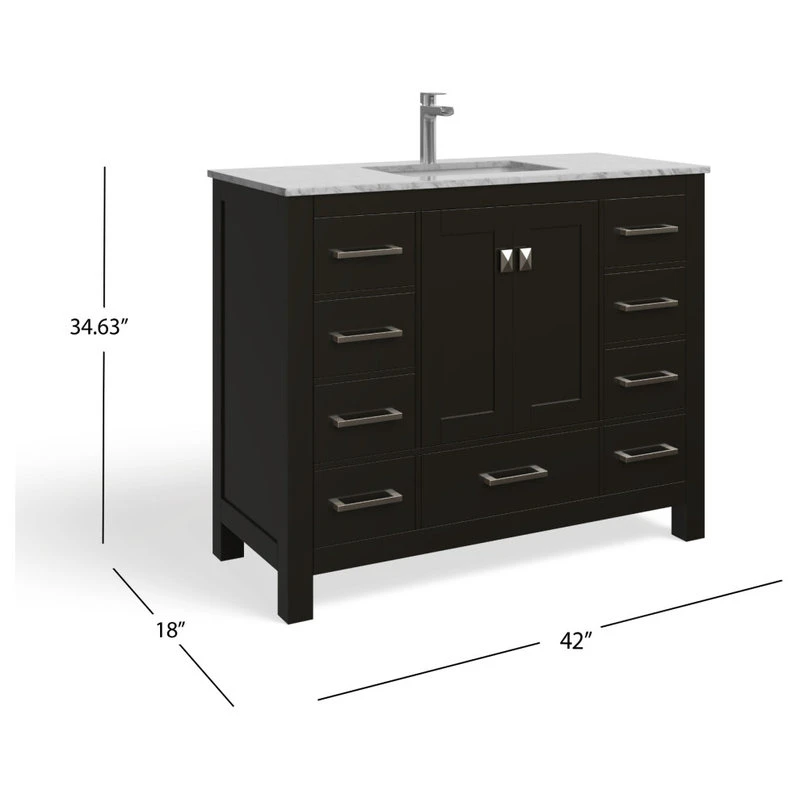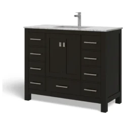 The Ashton bathroom vanity mixes modern clean lines and traditional charisma. With an ample amount of storage space hidden behind multiple soft-closing drawers and doors, the Ashton makes sure not to skimp out on modern-day luxury. Plus, with the help of sturdy natural materials like solid wood and marble countertops, the Ashton is crafted to last for however long you need it (and more).