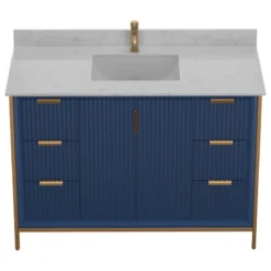 When the clock strikes “me time,” escape to the comforts of the Everleigh. This playfully sophisticated vanity combines contemporary style with golden pops of glamour for just the right amount of modern. Marbled composite stone with natural veining sits atop corrugated cabinet doors which offer up ample storage. You’ll love its soft-close hardware and rectangular undermount sink design almost as much as its gold-finished metal frame and handles. Whatever you’re freshening up for, the Everleigh has everything you need – plus bonus style points to boot.