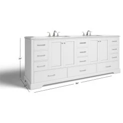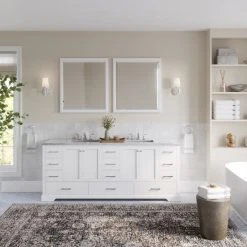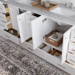 The lavish Laurel vanity is a gorgeous, marbled vanity designed to complete any oasis. With a bevy of storage built right in, you can easily keep your countertops clear of any clutter—a priceless perk when you’re sharing space. And speaking of sharing, the transitional Laurel vanity comes with two porcelain sinks, which means you’ll have ample elbow room all to yourself. As the cherry on top, this vanity is designed with soft-closing doors and dovetail drawers to keep early-morning and late-night noise on the low.