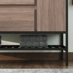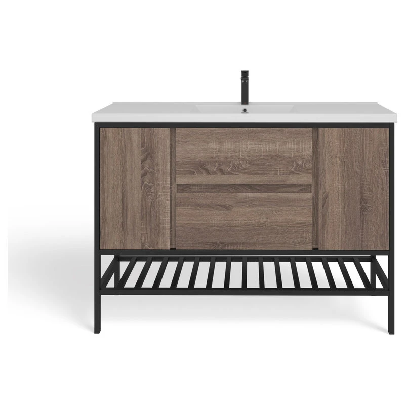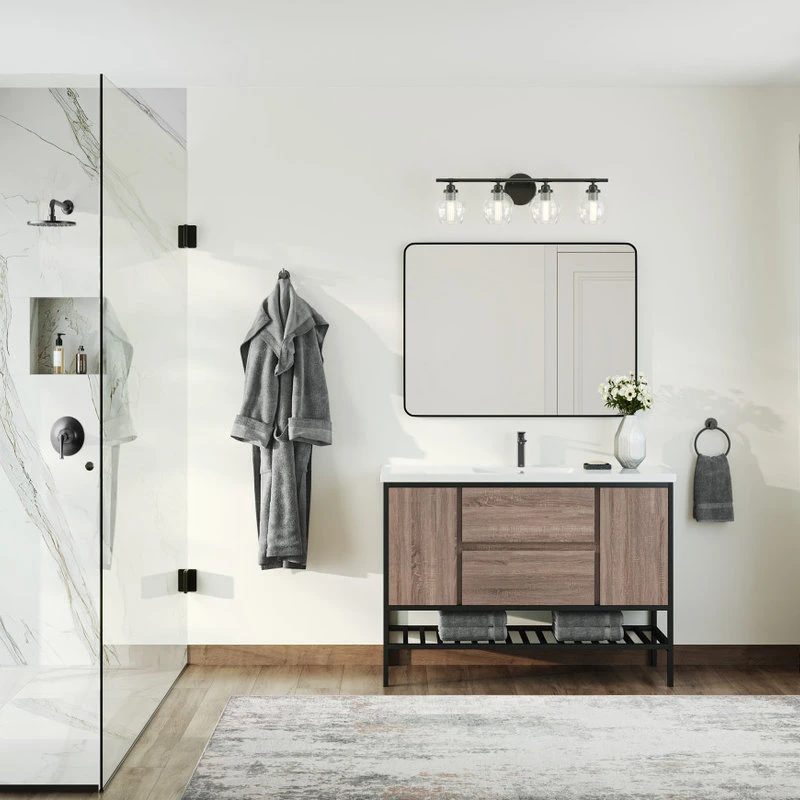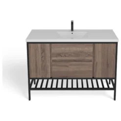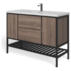Combining industrial style with home-style warmth, the Levi bathroom vanity ensures you’ll get everything you want (and need) from your bathroom centerpiece. With soft-closing double drawers and two cabinet doors, you’ll have plenty of bathroom storage for all of your powder room essentials. A rustic, reclaimed look outlined by a thin black metal frame work as the cherry on top of what makes the Levi vanity stand apart aesthetically and functionally