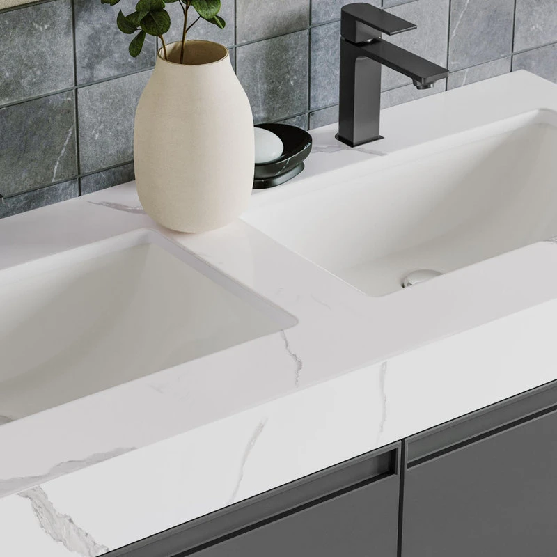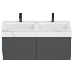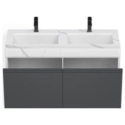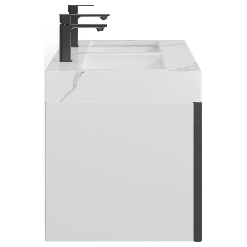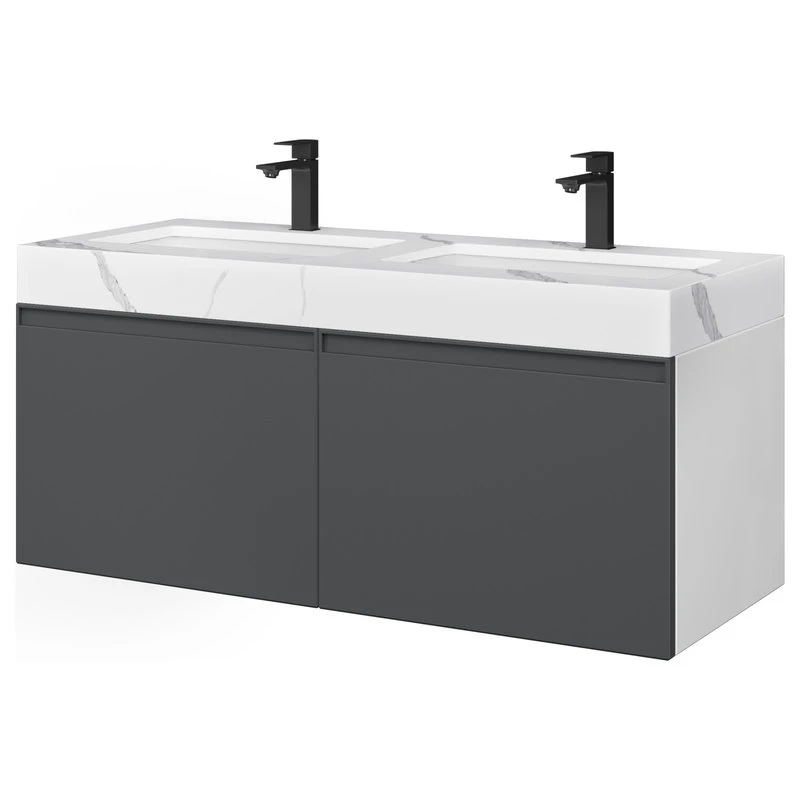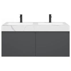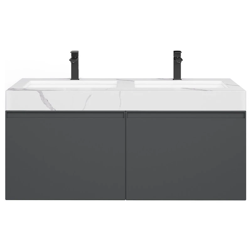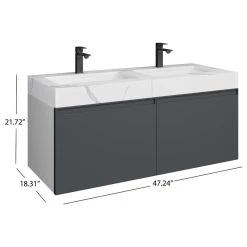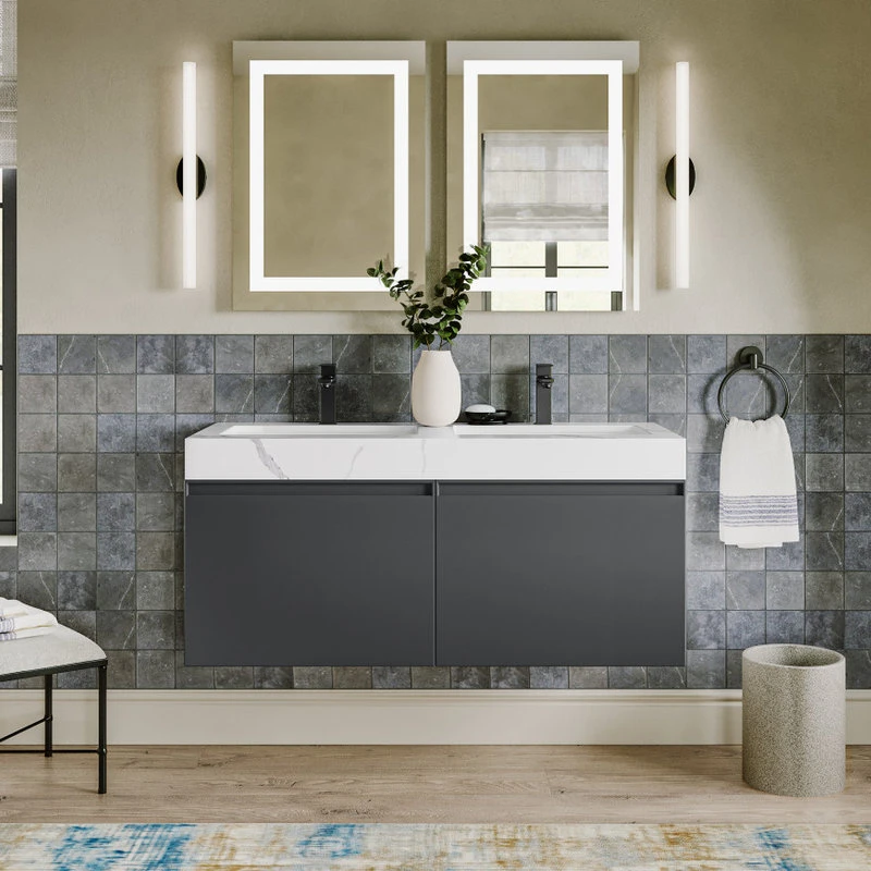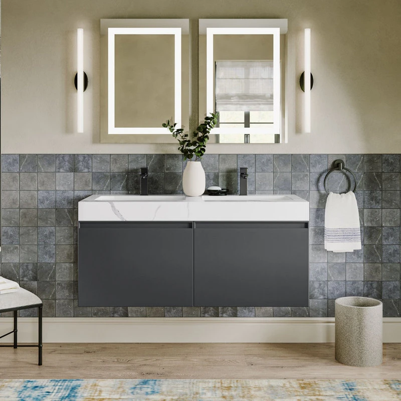 The Monolith floating vanity from MOD adds a bold, strong look to any bathroom. 48 in length, this vanity boasts two basins set into a stout white and gray quartz premium countertop that is nothing if not a sleek and modern contrast to the dark matte gray cabinetry. Undercounter storage is easily accessible via two pull out shelves.