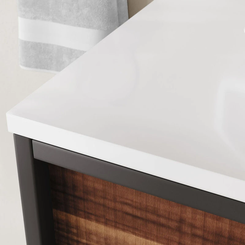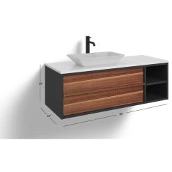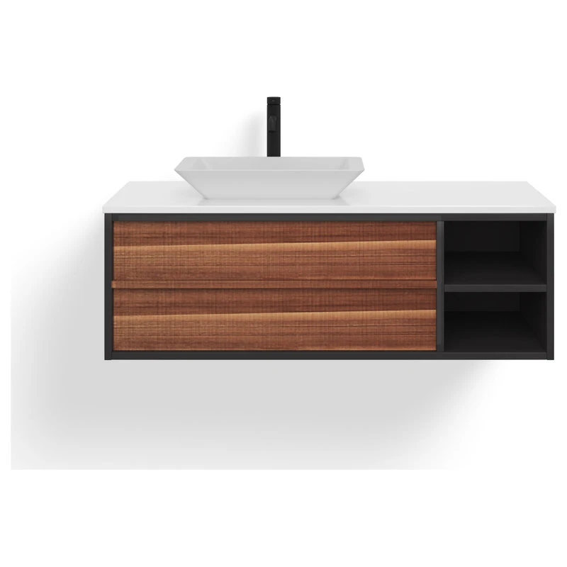 Reinvent your routine with the Rhone. Contemporary from countertop to cabinets, this wall-mount vanity takes traditional craftsmanship with its natural wood-textured drawers and tops it off with a touch of innovation. A unique, acrylic top-mount sink adds intrigue and ingenuity to its pure white countertop. Below, extra-wide drawers and open shelving combine for storage that’s both functional and decorative. Sturdy, striking, and a breeze to clean, the Rhone is ready to take your bathroom into the modern age.