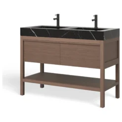 Sleek and understated, this 48-inch chestnut oak vanity will stand the test of time. The Bulgaria Gray Quartz top features recessed double-sinks and a delicate veining pattern laced within the light wood bringing movement to the eye. The handle-free drawers, smooth countertops and open shelving style are perennial and functional, living up to the ideals of the MOD brand.